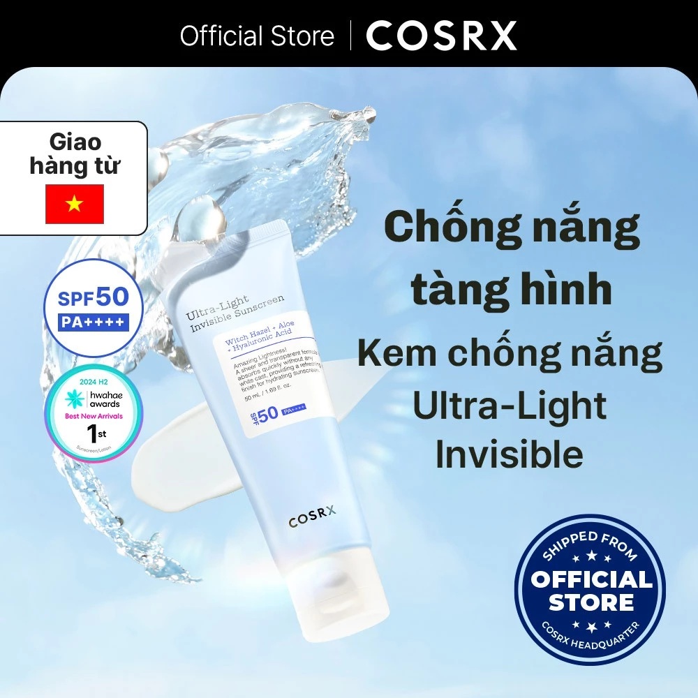 - Cosrx Invisible Sunscreen (có thể là dòng Aloe Soothing Sun Cream hoặc các loại kem chống nắng hóa học mới của hãng) là kem chống nắng có chỉ số bảo vệ cao, nổi bật với kết cấu siêu nhẹ, thẩm thấu nhanh và không để lại vệt trắng, tạo cảm giác như “vô hình” trên da.