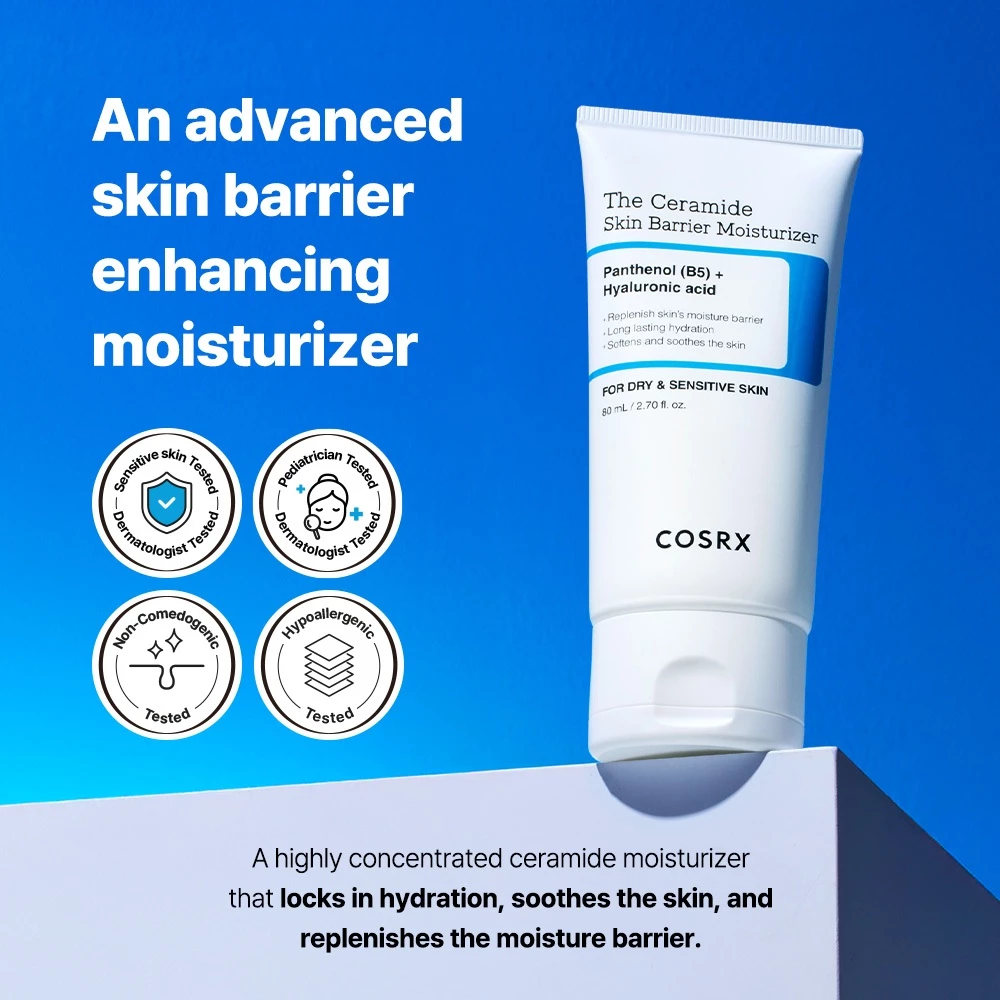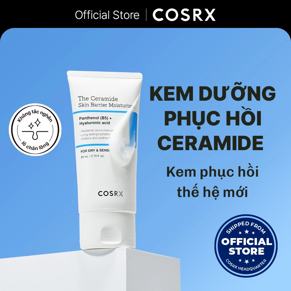 - Kem dưỡng ẩm COSRX The Ceramide Skin Barrier Moisturizer là sản phẩm dưỡng da cao cấp từ thương hiệu COSRX nổi tiếng của Hàn Quốc, chuyên tập trung vào việc tăng cường và phục hồi hàng rào bảo vệ da. Sản phẩm được thiết kế dành riêng cho làn da khô, nhạy cảm, dễ kích ứng hoặc bị tổn thương do môi trường, mụn hoặc các yếu tố bên ngoài. Với công thức chứa ceramide đậm đặc, kem không chỉ cấp ẩm sâu mà còn giúp da tự sản sinh ceramide tự nhiên, tạo lớp màng bảo vệ vững chắc, ngăn ngừa mất nước và các dấu hiệu lão hóa sớm.
