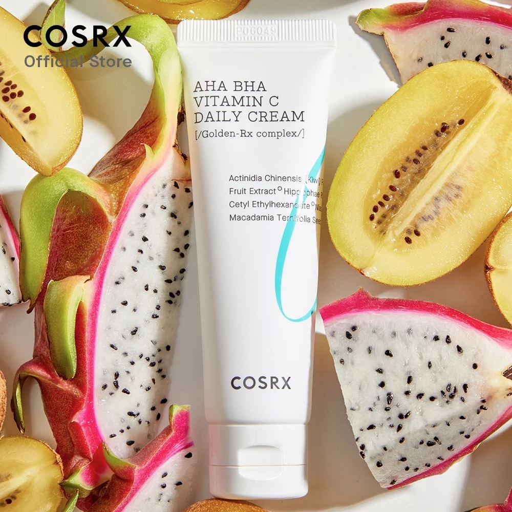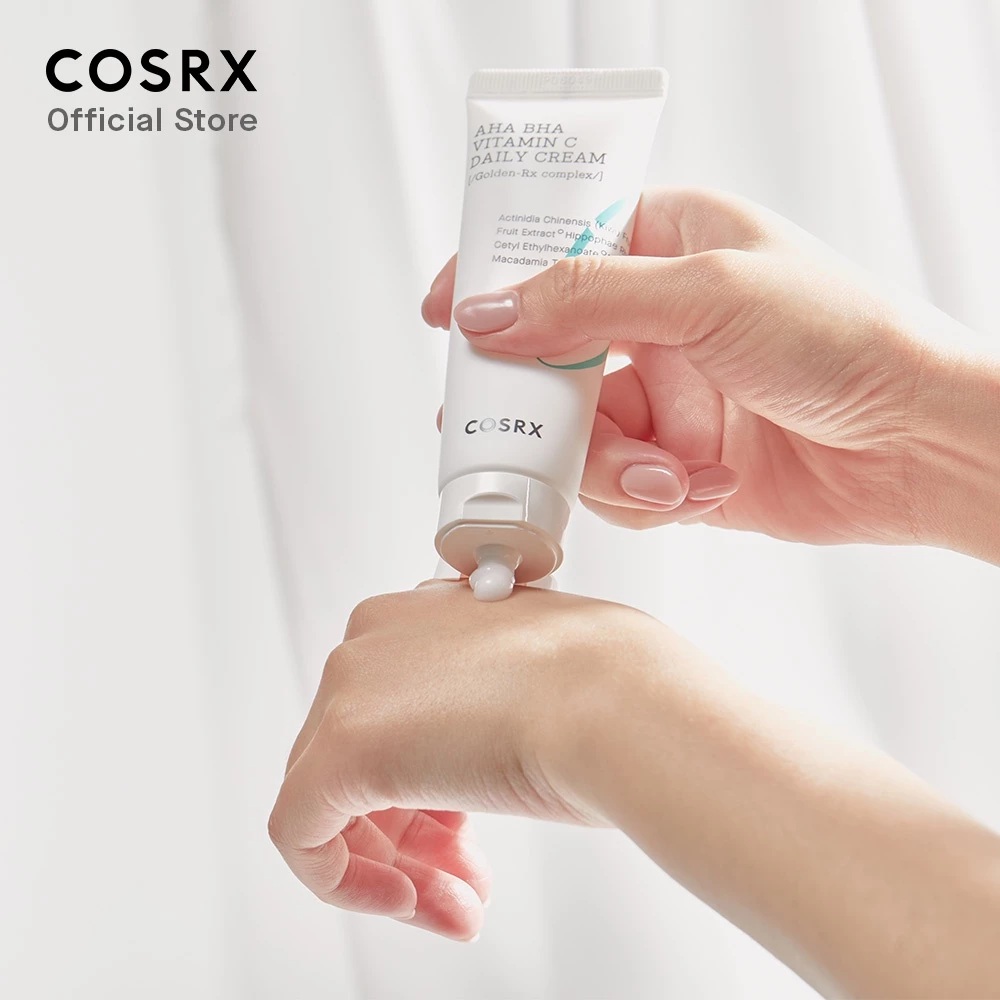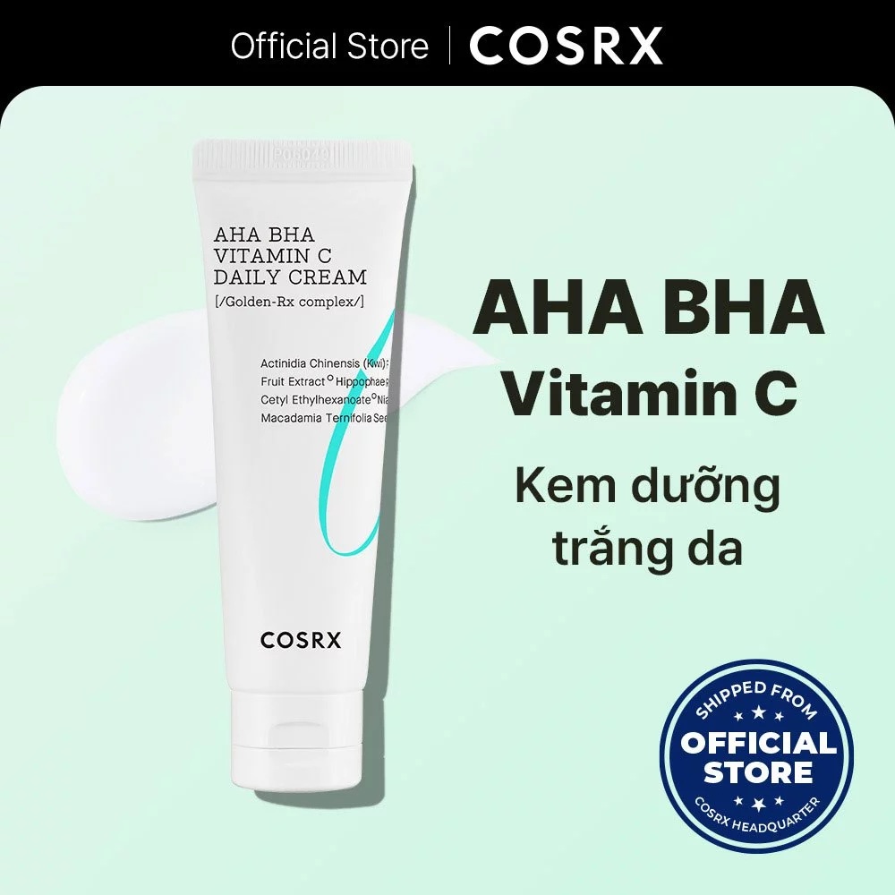 - Cosrx AHA BHA Vitamin C Daily Cream là sản phẩm kem dưỡng đa năng từ thương hiệu mỹ phẩm Hàn Quốc COSRX, thuộc dòng Refresh ABC chuyên tập trung vào việc làm sáng da và cải thiện kết cấu da hàng ngày. Với công thức kết hợp các axit tẩy da chết nhẹ nhàng (AHA, BHA, PHA) cùng vitamin C ổn định, kem này giúp đánh bay lớp da chết, làm đều màu da và mang lại làn da rạng rỡ mà không gây khô rát. Dung tích 50ml (1.69 fl.oz), kết cấu mỏng nhẹ, thấm nhanh, không bí lỗ chân lông, phù hợp cho routine sáng/tối. Đây là lựa chọn lý tưởng cho da xỉn màu, thô ráp, lỗ chân lông to hoặc da dầu/hỗn hợp, giá khoảng 400.000 – 600.000 VNĐ, thường được khen ngợi vì hiệu quả “glow” tự nhiên mà dịu nhẹ.