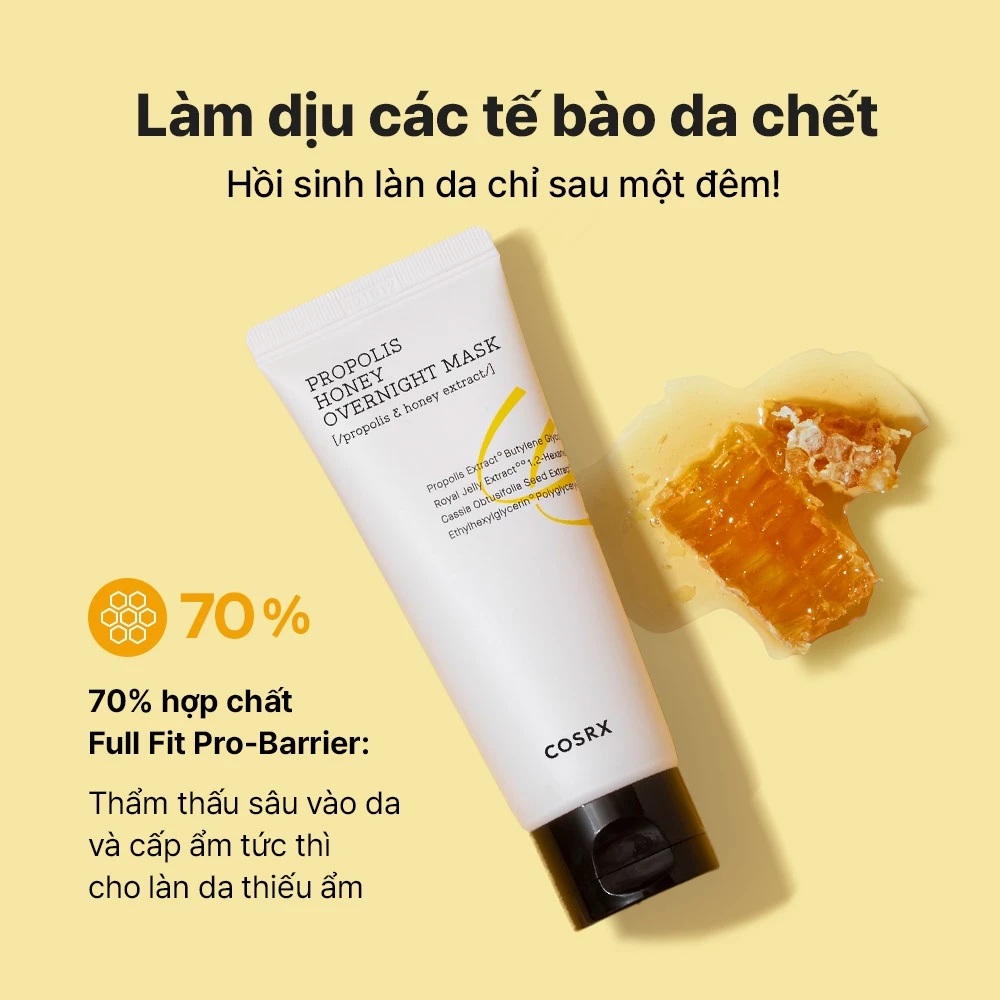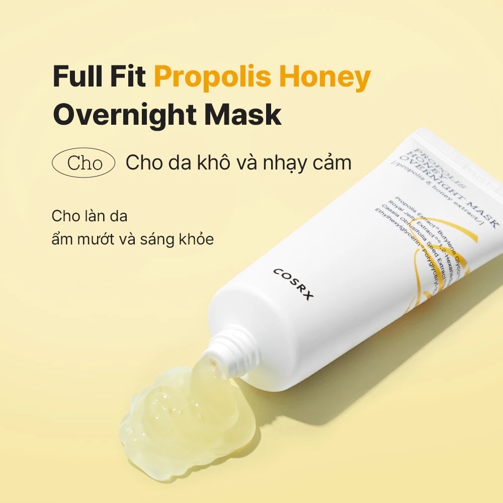 - Cosrx Propolis Honey Overnight Mask (trước đây thường được gọi là Ultimate Moisturizing Honey Overnight Mask) là một loại mặt nạ ngủ đa năng, tập trung vào việc làm dịu, cấp ẩm sâu và nuôi dưỡng da trong lúc bạn ngủ. Sản phẩm nổi bật với hàm lượng cao chiết xuất từ keo ong (Propolis Extract), mang lại làn da căng mọng, khỏe mạnh và sáng hơn sau một đêm.