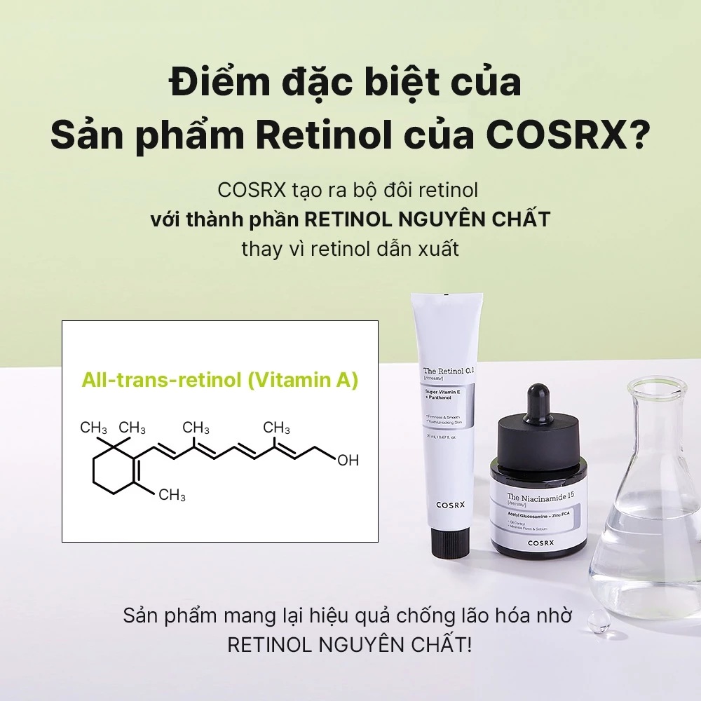 Cosrx The Retinol 0.5% là tinh dầu chống lão hóa chứa 0,5% retinol tinh khiết (vitamin A) – hoạt chất nổi tiếng trong việc kích thích tái tạo tế bào, làm mờ nếp nhăn và tăng độ đàn hồi da.